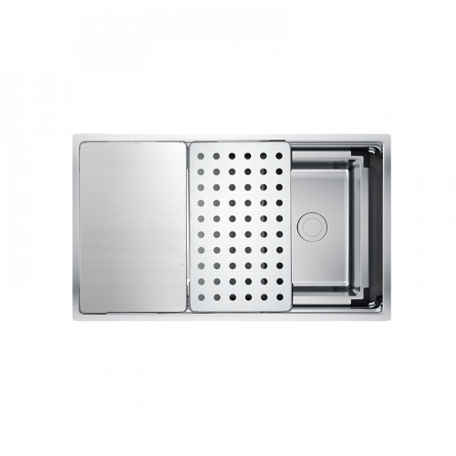 - Thiết kế hiện đại với gờ hạ bậc – tích hợp phụ kiện thông minh: Siphon, giá úp bát inox, chậu rửa nhỏ, thớt inox, thớt inox lỗ